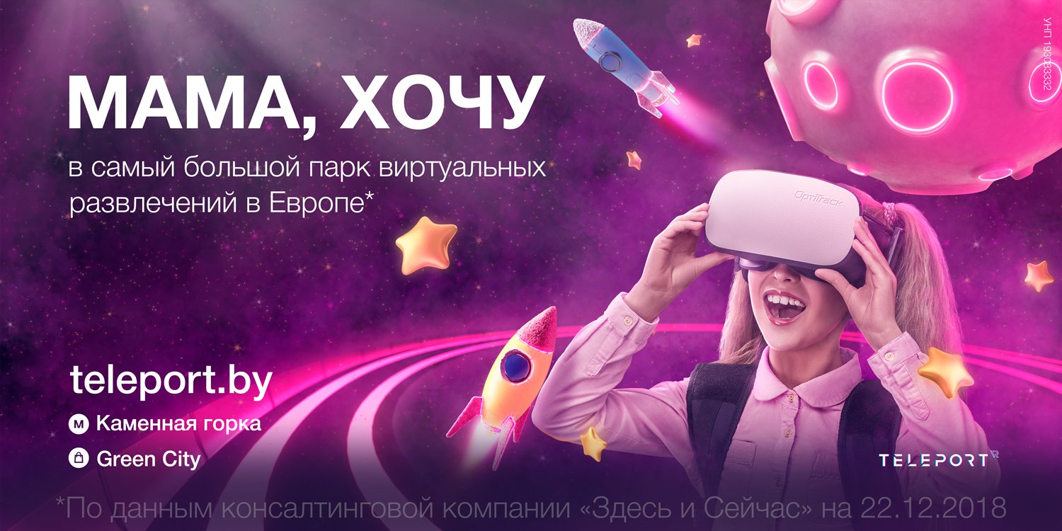 Концепция «Мама, хочу!», отражающая интерес детской аудитории, которая приходит в Teleport с родителями. Главный герой — девочка 7-9 лет: она в VR-очках, удивленная и очарованная, мечтающая побывать в космосе, увидеть волшебный мир в реальности и умоляет маму пойти в самый большой парк виртуальных развлечений.
