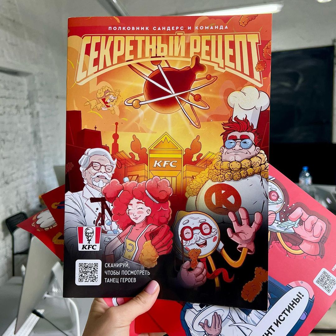 Это limited edition история с элементами дополненной реальности про захватывающие приключения Полковника Сандерса и его помощников. Вдохновленные нейросетью, куриными ножками, комиксами Marvel и DC, мы разработали уникальных героев, сюжет, иллюстрации и интерактивные стикеры с QR-кодом, отсканировав которые можно увидеть любимых 3D-персонажей, танцующих в дополненной реальности.