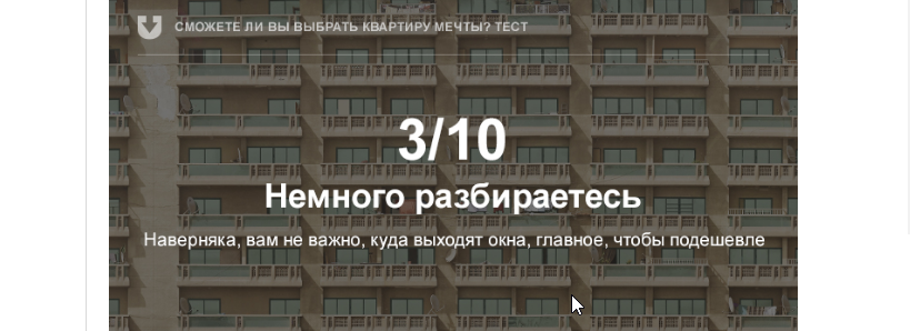 Всегда интересно узнать, насколько ты в чем-то профи. А если собрался обзавестись своей квартирой, то тем более придется пополнить свои знания в этом вопросе. Пройдя, на первый взгляд, простой тест, вы поймете, нужно ли вам почитать еще пару-тройку статей и взять консультацию или можно смело выбирать квартиру мечты и не беспокоиться, что вас кто-то обманет. Проект вышел довольно полезным, потому рекламу «съедаешь» легко.