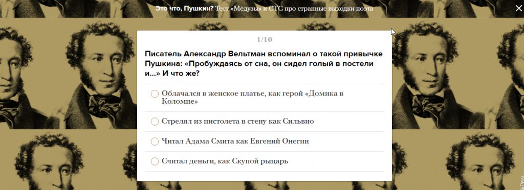 Перед выходом сериала «Пушкин» на СТС «Медуза» и телеканал в лучших традициях портала сделали тест. И хотя сериал совсем не о поэте, а об обычном воре-карманнике, который просто до безумия на Пушкина похож, читателям предлагают покопаться в фактах из жизни реального Александра Сергеевича.